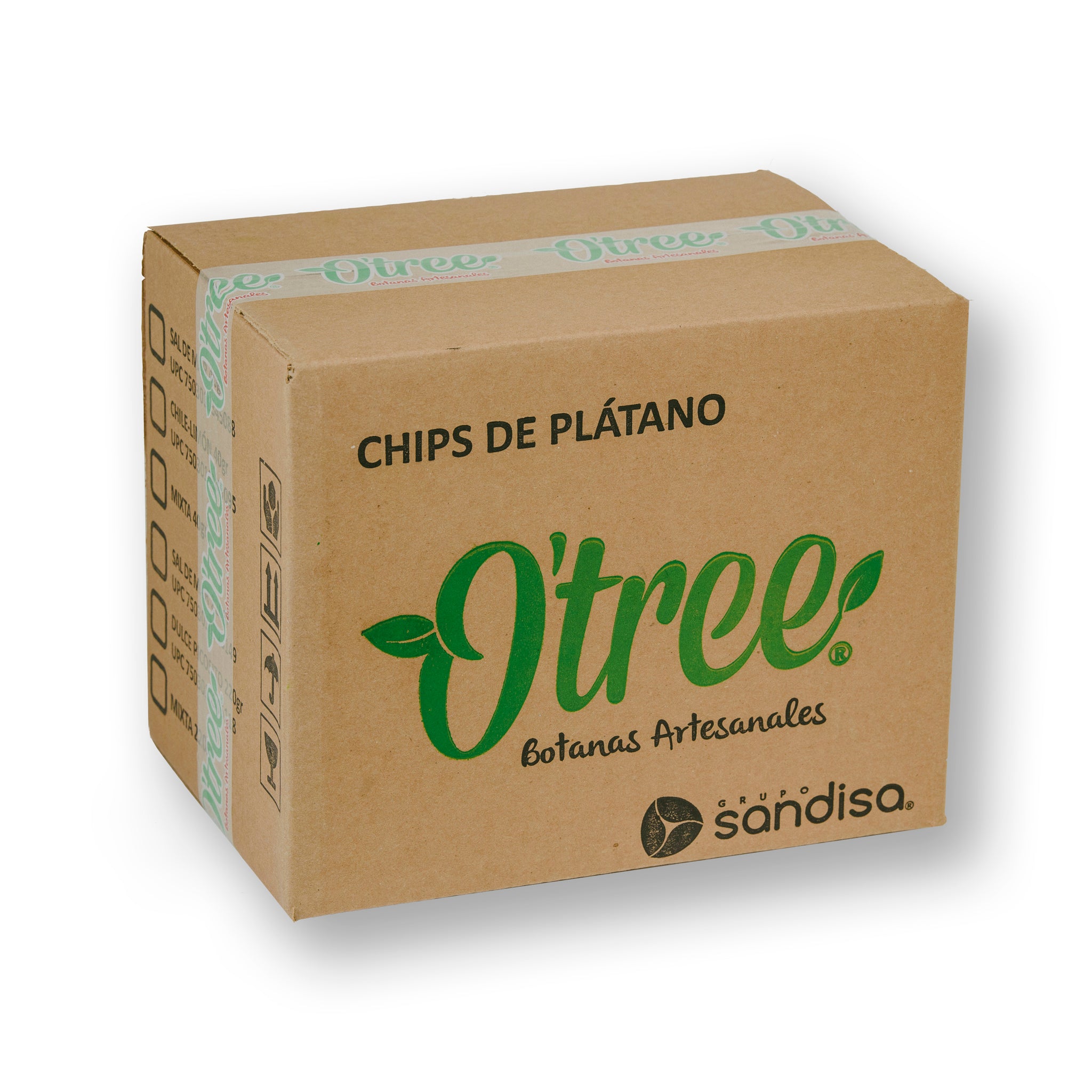 Masterpack con 24 bolsas individuales de chips de plátano mexicano condimentado con sal baja en sodio.